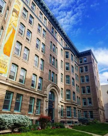 The building, Saint James Court Historic Apartments, has classic character including hardwood floors, stained glass, abundant and large windows, marble entrance, completely restored bird cage elevator, and flower garden. At Saint James you'll feel cozy, comfortable, and right at home.