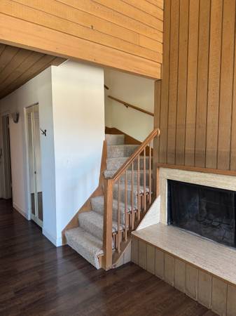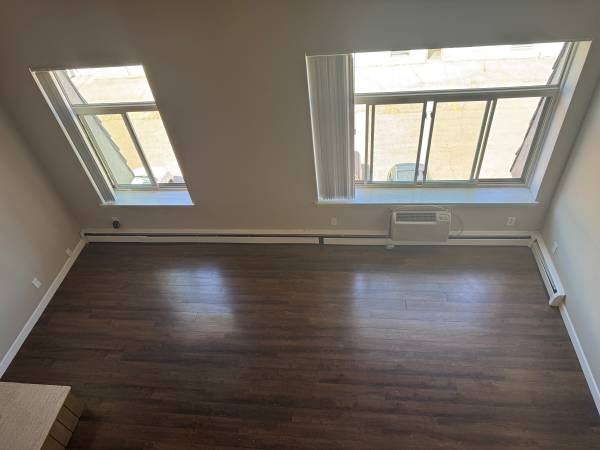 The first floor of the apartment has the main living area, fireplace and a half bathroom. The second floor loft is the bedroom and includes a walk-in closet and full bath. Tall windows which are great for natural light and houseplants. One bedroom has two full closets and the other has a walk-in.