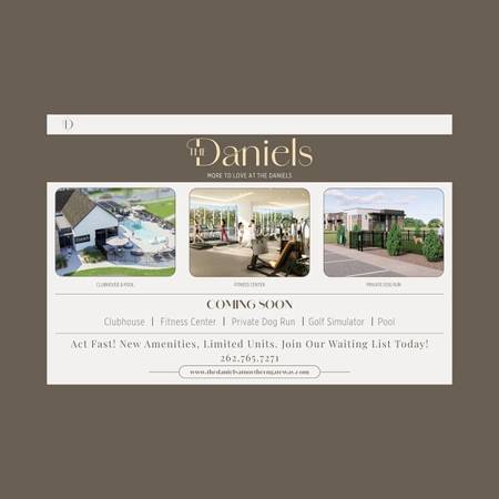 Elevate Your Living Experience!Discover the allure of The Daniels, Modern Living at Northern Gateway. Nestled in the heart of rapidly growing Saukville, WI, these apartments offer a fresh perspective on modern living, blending bright and inviting floor plans with privacy and tranquility. With a seamless connection to nearby hotspots, enjoy the peaceful and lush landscapes while also soaking up Saukville’s vibrant energy.