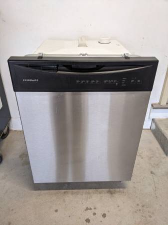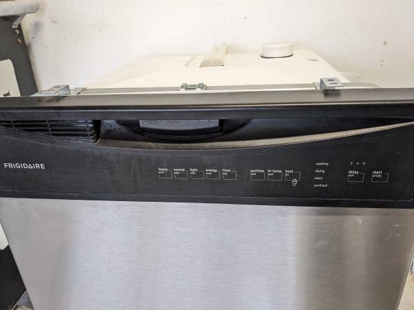 Frigidaire dishwasher in good condition for sale. The dishwasher front is stainless steel with a black control panel and trim. Standard size (24” wide). Different features include: