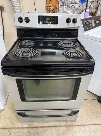 REFURBISHED KENMORE ELECTRIC RANGE. 4 BURNER COIL BURNER COOKTOP. OVEN HAS BAKE, BROIL AND SELF CLEAN FUNCTIONS. HAS AN OVEN LIGHT, KITCHEN TIMER AND COOK TIMER AND DIGITAL TIME DISPLAY. HAS BEEN FIXED AND TESTED, WORKS GREAT. SEE IN OPERATION. VERY CLEAN INSIDE AND OUT. COLOR IS STAINLESS STEEL.