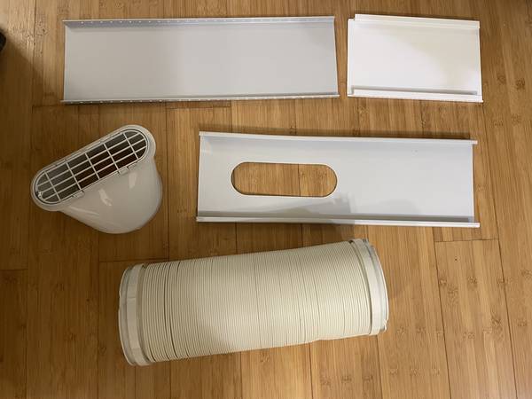 - Window vent hose, attachments, and panels included. There is one panel (the shortest, white piece in the photo) that wasn’t original with this unit. It doesn’t fit as neatly together with the other panels, but I used it to extend the paneling to fit a tall vertical window.