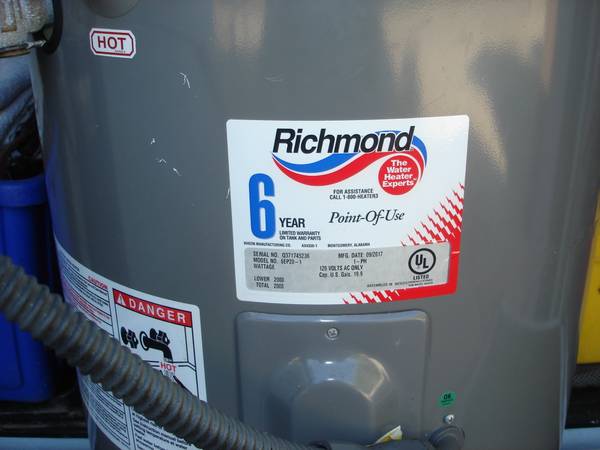 Richmond water heater, 19.9 gallons, 120 volts ac. In good condition