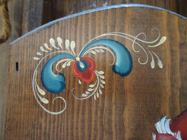 GNOME AND LADYBUG HAND PAINTED SLED Detailed hand painted sled with a gnome talking to his friend - the Ladybug. Rosemaling accent. Signed by painter. String attached for hanging. Sled is approx 18...