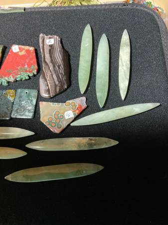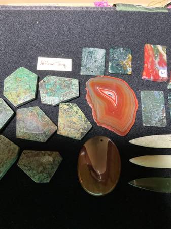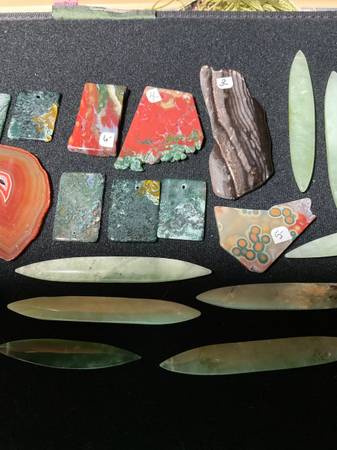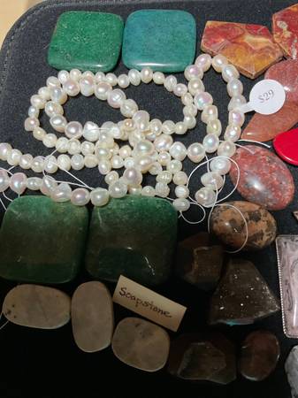 I am not a beader, nor am I familiar with the types of stones. Some of what I have here is named ,others are not. So here we go…..there is lace agate, tiger skin agate, soapstone, dyed jasper and 2 strings of pearls plus 2 pendants. There are also 2 strings of pearls marked $29 each ( I have no idea )…….