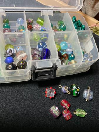 Finally I am offering a small plastic container of glass beads. The side you don’t see has more beads but they’re all small blue glass beads. Great lot !!!