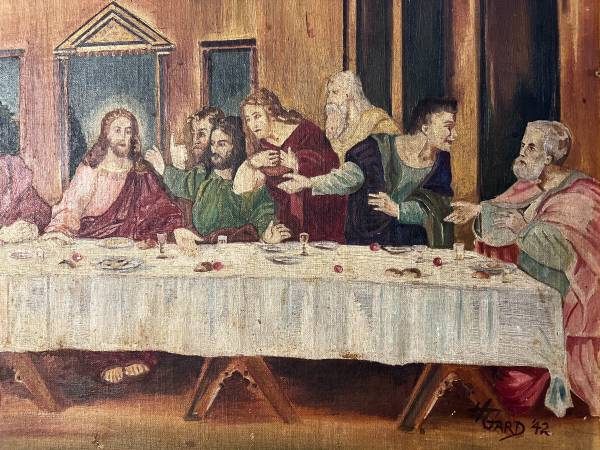 This is an old framed original oil painting of the Last Supper. It shows normal expected signs of age and the frame shows more wear than the painting as shown. It measures about 25-1/2 inches by 19-1/2 inches including the wood frame. Very nicely done.