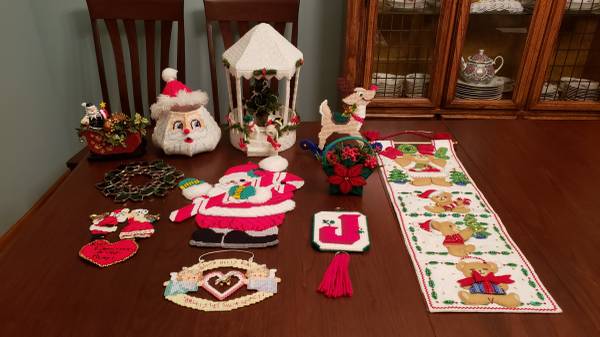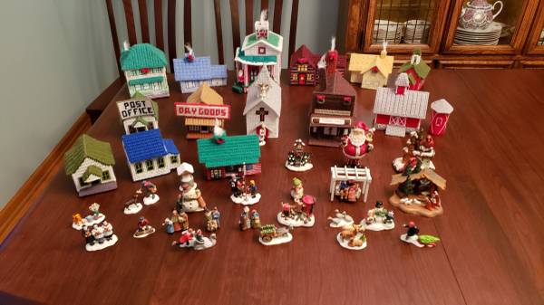 Grandma spent many hours creating these wonderful holiday items. Now it's time to pass them on. There are 14 village pieces, 25 hand painted figurines, 99 Christmas items, and a hand crafted gazebo with a built-in music box - 138 pieces in all! Also included are 2 totes to store them away. If you're interested, call Jim at show contact info