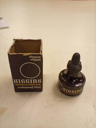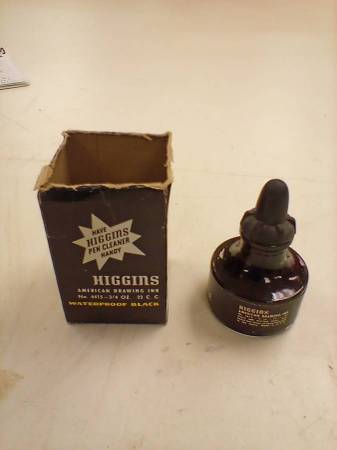 Vintage Higgins American India ink bottle w/stopper&box #4415 drawing ink close to a full bottle