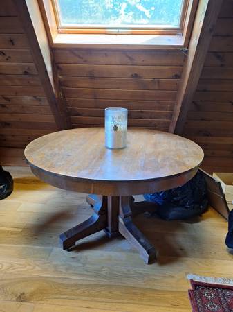In very good condition and has not been refinished and has no broken parts. Opens by latch on the bottom. Comes with 1 extension to extend the table 12 inches from the 48 round. Pedestal design allows much more foot space underneath. A very nice piece that will compliment your home. Probably from the 1940's or 50's. Call or text or use email given. Cash only and you move. show contact info
