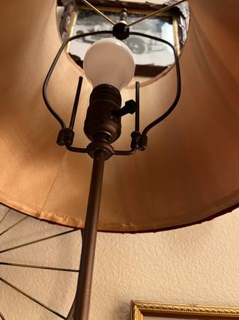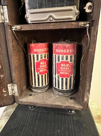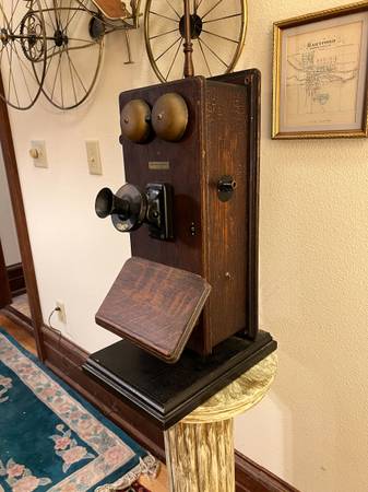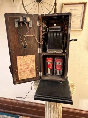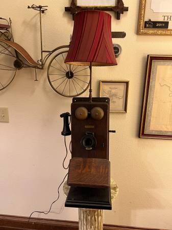 This is a very nice free standing professionally fabricated wall lamp phone so you do not need to mount it to a wall. It even has some old antique batteries on the inside of it. It does still have the hand clank which turns over the original magneto properly and the bells ring nicely. The shade does not go with this lamp, and I just put it on there to show what it would look like with a shade. The plug-in wire is still working fine but I will leave it up to you if you want to replace that and it is never a bad idea. The on and off switch on the socket still functions fine. These old wall phones are very heavy and can be a pain in the neck to actually mount them on a wall because you need to anchor the phone to some solid wall studs. This is the nicest professionally fabricated table lamp conversions that I have ever seen over many years of playing with Antiques. It stands about 40 inches tall and even has an adjustable harp so that you can set it for the height of the shade that you choose to put on it.