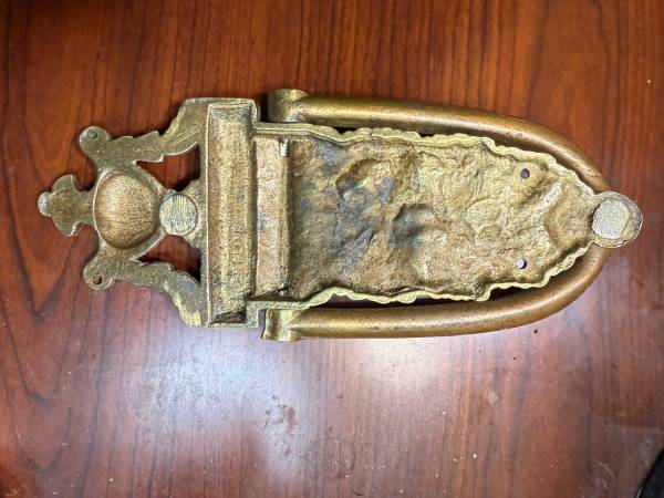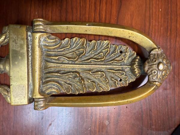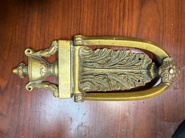 This antique original door knocker hails from the Sheraton period Boasting a heavy cast Brass Construction that speaks of its enduring quality. Standing at a proud, 9 inches tall it features a timeless acanthus and urn theme instantly lending a classical touch to your doorway. The door knocker exhibits a charming patina, a testament to the craftsmanship and is sure to add a touch of historical sophistication to your home. Its antique beauty is complemented by the warm hues of the highly detailed brass material making it not just a functional piece but a work of art that greets visitors with a blend of nostalgia and style. If you use Paypal, I can ship this to you and just send me your ZIP Code so I can let you know what the shipping cost would be.