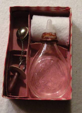 1920's Doll Nursery Set / Glass Bottle / Pacifier / Blanket / Bell Rattle Made in Japan / 3.5" x 2.5"