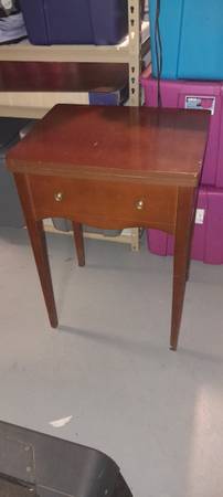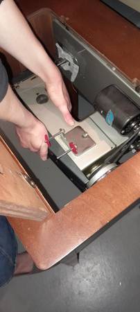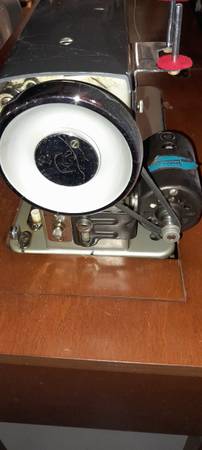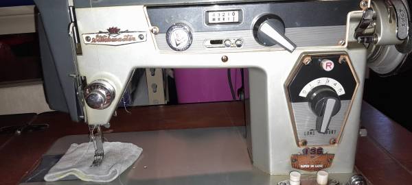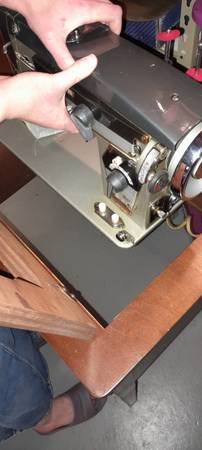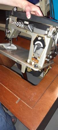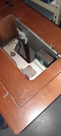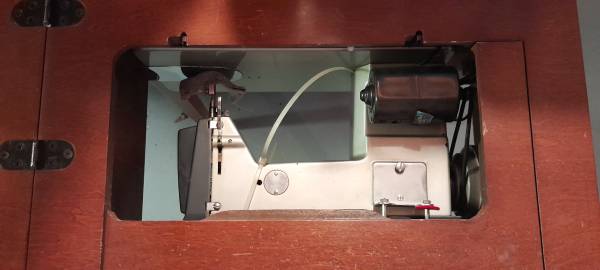 135 Automatic Super De Luxe in a beautiful mahogany table. Doesn't take up much space. Keep the clutter down. Then when on a project, sewing surface is level-built into the table, fantastic!