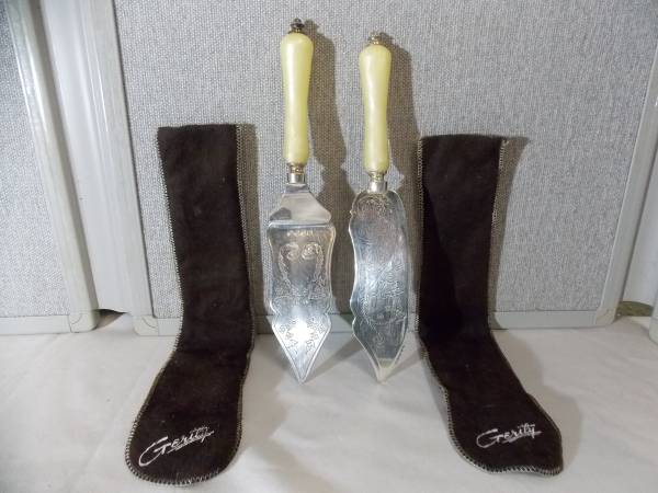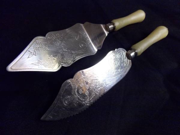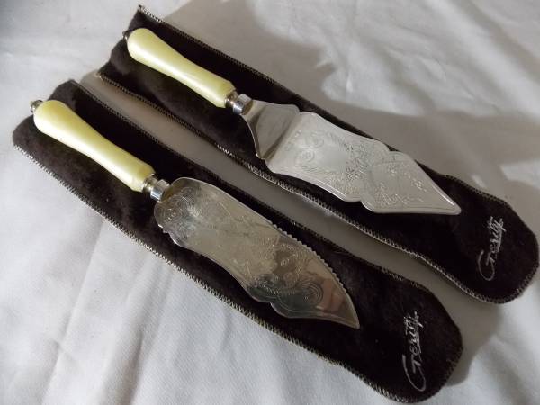 For Sale - Vintage Gerity Silver Plate Cake Knife and Server. Both adorned with Faux Mother of Pearl handles and beautiful scroll engraving come complete with felt anti-tarnish storage bags. Excellent condition. Please call or text show contact info