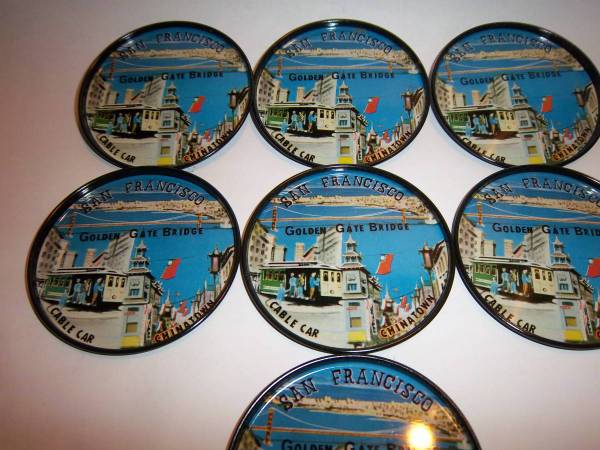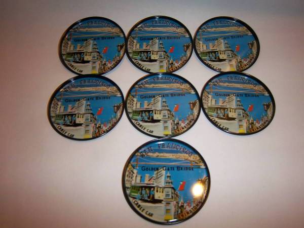 Seven metal coasters from San Francisco 1960's. Free local delivery.