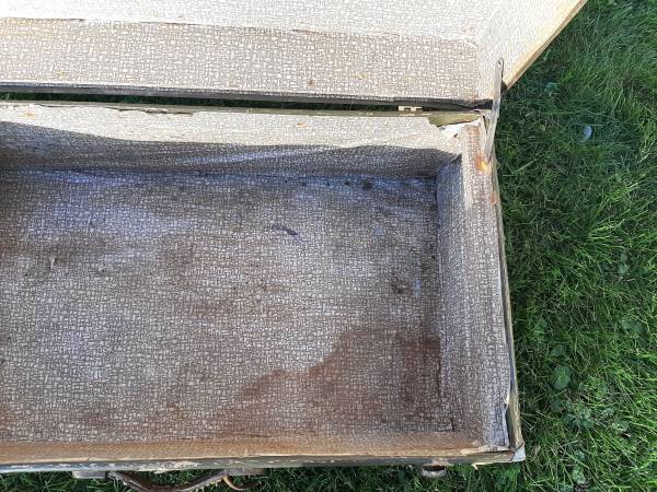 Issues. The 'bottom' of the locking mechanism is no longer attached to the trunk but is attached to the rest of the mechanism because the lock is locked. The key to the lock is missing. The inside tray is missing. There's noticeable wear around the closing hardware. Obvious wear to the leather of the 'front handle'. The paper lining along the inside has numerous obvious issues. The bottom of the trunk has many noticeable scratches. There are scratches throughout the outside of the trunk. The paint has cracked giving it an authentic look.
