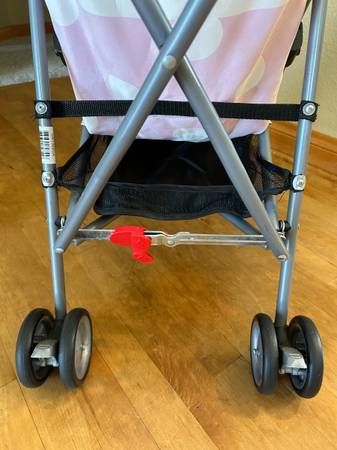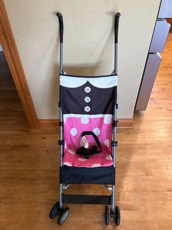 Used stroller, pink and black with Minnie Mouse print. Great for kids or dolls. Folds up for storage. Smoke free home. $10 Text preferred