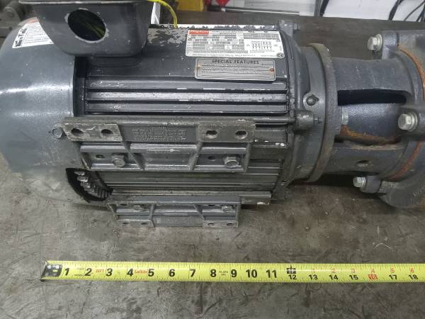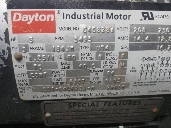 No Text. dayton 5hp 3495 rpm, 208,220/230/460/480 3 phase motor, 7/8 keyed shaft, continuous and inverter duty, foot mounting and face frame mount, frame # 184JM. good bearings/runs good. pickup in...