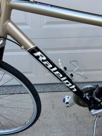 This Raleigh C40 Comfort Hybrid Bike is in amazing overall condition featuring a riser bar handlebar with add-ons for comfort, 700C wheels, 3 x 8 gears, V-brakes and a rear rack. The frame is made of aluminum and the bike includes front suspension, grip shifter, and adjustable seat. With a vintage style and beige color, this Raleigh C40 is a comfortable and stylish choice for men looking for a reliable hybrid bike.Please view all photos to base your own opinion on condition. Located within 1 mile of the Milwaukee County zoo if you would like to stop by to take a cruise prior to purchasing. Also, have matching woman’s bike.