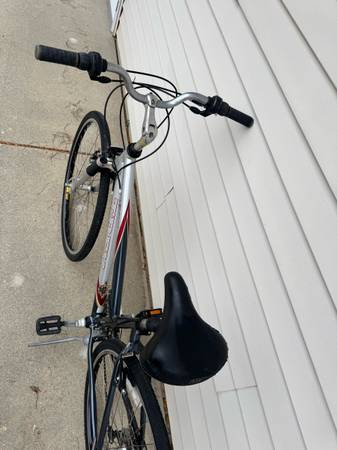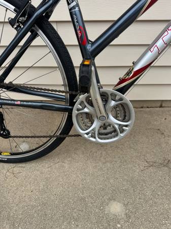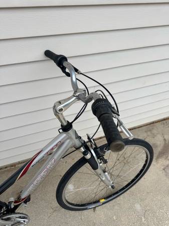Trek 7300 Step-Through Hybrid Bike. 24 speed. 700x38c Bontrager tires. 17 inch aluminum frame. Has shock absorber seat post for comfort. Front shock absorber. Adjustable handlebar stem for riding in the upright position. The bike shifts through all the gears. The brakes work well. Handgrips and seat are in good condition. This is a very comfortable bike.