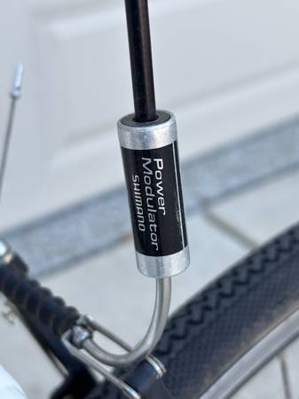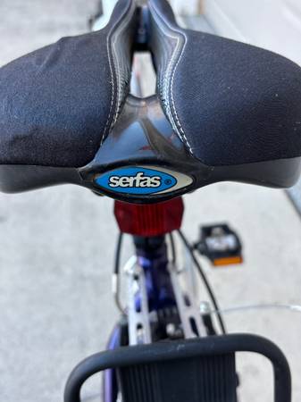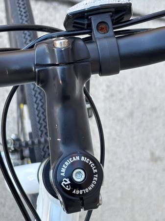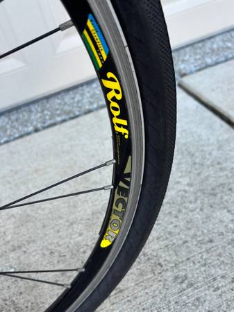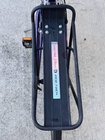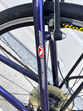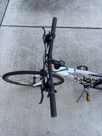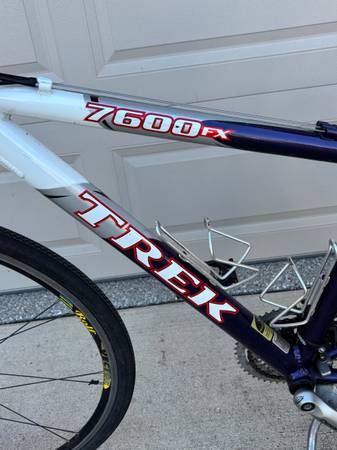 Trek 7600 FX hybrid bicycle with lightweight Alpha ZX custom aluminum frame and Rolf Vector Rims. Features Shimano Deore drivetrain, Avid brake levers, and Promax brakes. Includes double water bottle cages, rear cargo rack, and Serfas saddle.