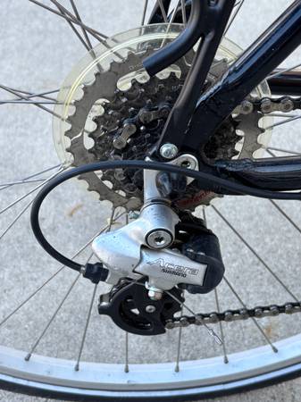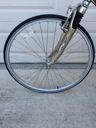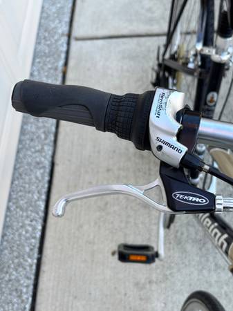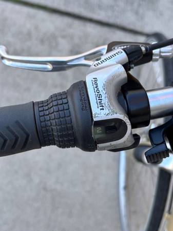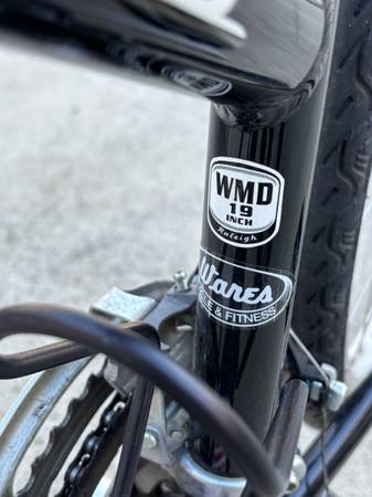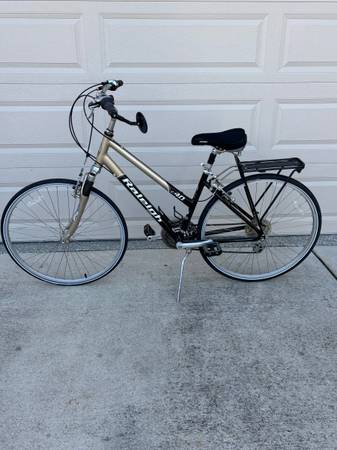 The woman's is a medium size, 19 inch frame bicycle designed specifically for women. It features a beautiful aluminum frame and 27.5 inch clincher tires, providing a comfortable and smooth ride. This hybrid bike also includes a kickstand, adjustable seat, and derailleur gears for easy gear changes. Plus adjustable mirror and rear rack. Perfect for recreational rides and everyday commuting, this Raleigh C40 model offers a stylish and functional option for female riders. The bike is an overall great condition, please view all photos. Stop by to take a cruise prior to purchasing, located within 1 mile of the Milwaukee County zoo. Also, have matching men’s extra large bicycle.