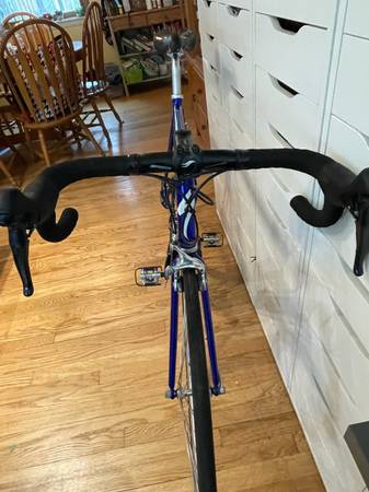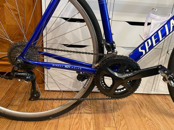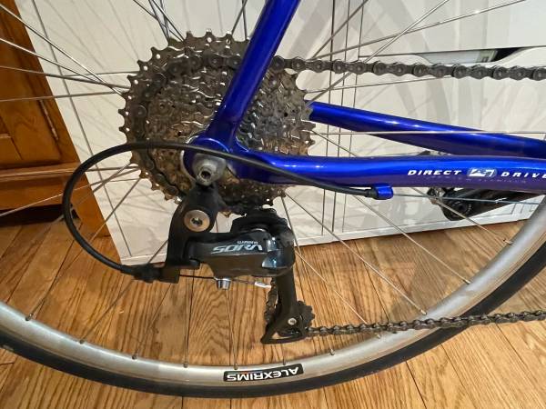 18 speed Shimano Sora (drive train components professionally installed in 2023: have receipts ) 50/34 compact crank and 11-34 cassette and Ultegra brakes and hubs. Choice of pedals: Look Keo Sprint, platform or SPD and Cateye cycle computer and extra tubes included.