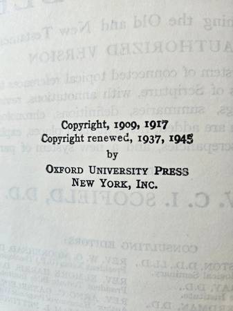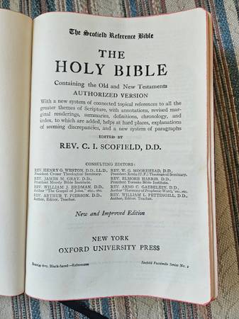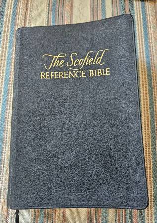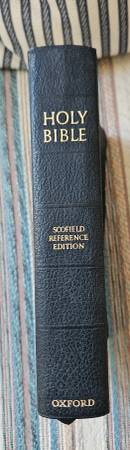 Vintage Scofield reference bible, leather edition, in very good condition. Bible cover has gold gilted lettering. Copyright 1945. Oxford University Press. Colored map pages. Can possibly meet...