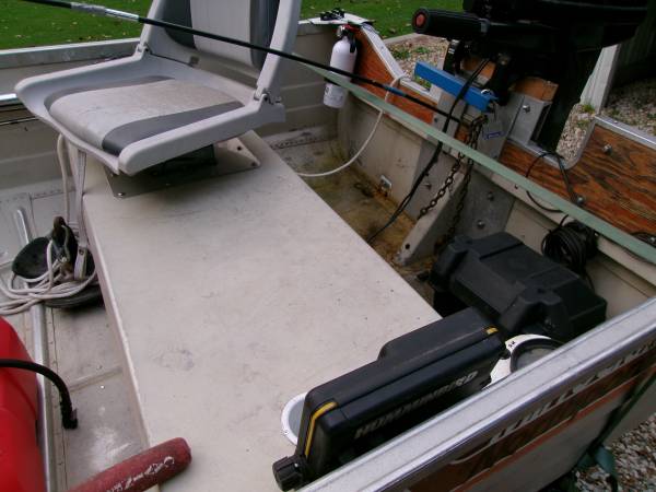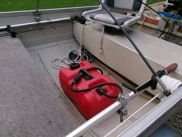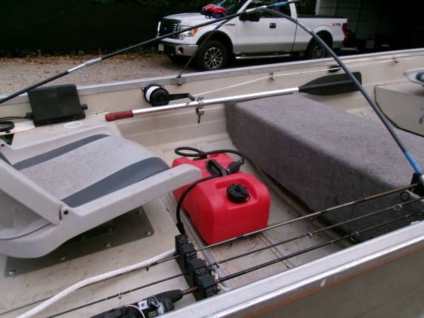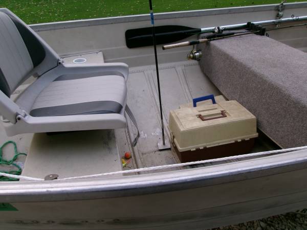 this boat is fully loaded and ready to use trailer takes a 2 in. ball for towing 3 new tires and rims galvanized trailer new lights new winch speedometer horn fire ext. fishing seats new battery and box new oars anchor mate and 2 rubber coated anchors fish finder cup holders bow and stern lights 2 covers motor starts and runs perfect motor fin and prop are perfect show contact info