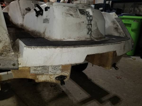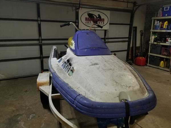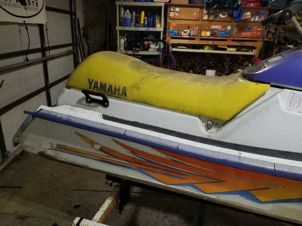 This is a 1995 Yamaha WR3 Waverunner 3 hull and some parts. No motor. No pump. No, it doesn't run. It's basically a stripped hull that's in rough shape. No trailer.