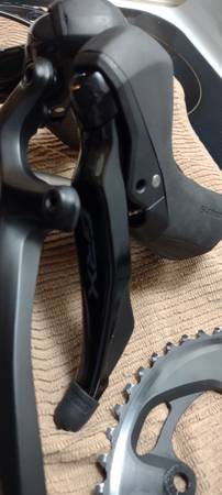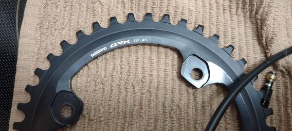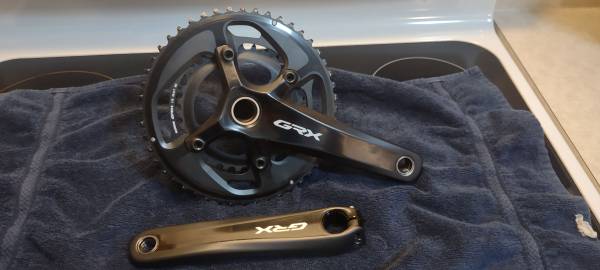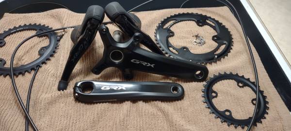 Shimano grx 400 shifters and grx rx810 crankset with new chainrings 31 tooth 42 tooth and 48 tooth arm length is 172.5 comes with some 2 mm chainring spacers to get a better chain line with a double set up asking $150 and this is a bargain considering the chainrings alone are $160 just for the chainrings.. these shifters and crankset have very little miles like 500 or so, because I ended up switching my gravel bike to a flat bar 1x10 set up..very clean no scratches at all.. if interested please email or text thanks for looking