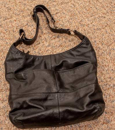 Black Leather Coach Shoulder Bag. Measures 12" wide by 11" tall without the strap. The strap is adjustable. Zipper opening on top that reveals another zippered pocket inside along with a couple side...