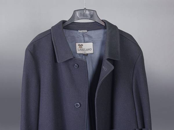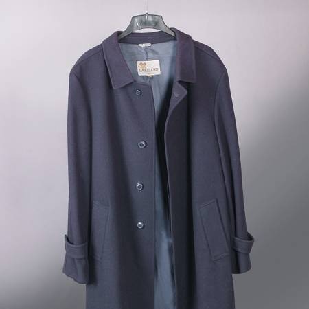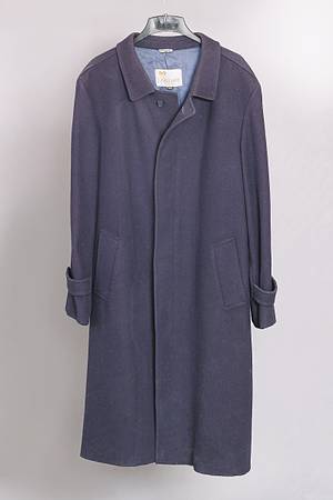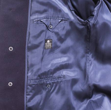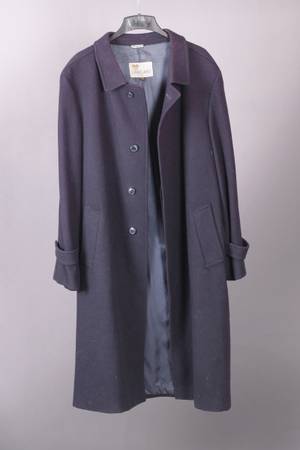 Navy, size 46 Long (48" length), pure wool made in Czechoslovakia. Coat has four lining pockets (two on each side). Very warm!