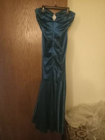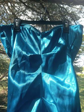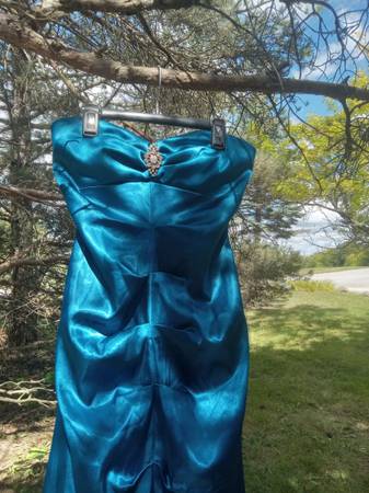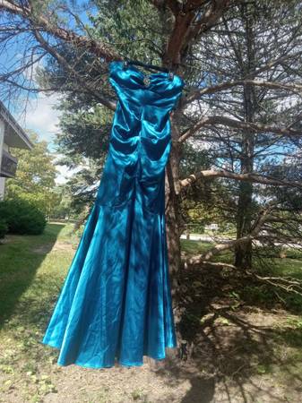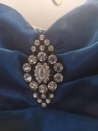 Gorgeous silky, luminous cobalt blue formal dress. Originally purchased from Windsor. The dress is strapless, floor length with a sweetheart neckline, bodice adorned with rhinestone centerpiece. The skirt is flared with "mermaid cut", with zipper in back. Size 11/12.