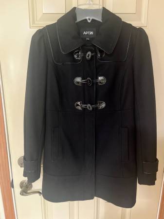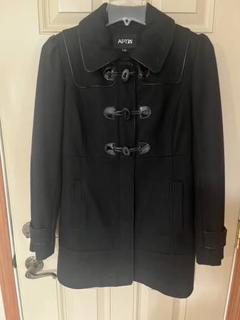 Ladies Apt.9 Black wool coat with Patent leather accents and removable hood. Coat is a size Medium and in very good condition. Please see pics and ask questions if you have any. Cash only!