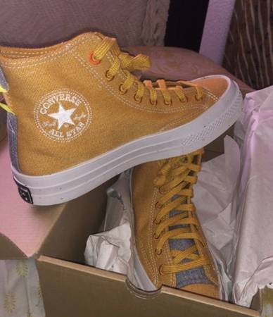 converse chuck 70 renew high top sneaker, gold with gray tongue. women’s size 9, men's size 7 description: “Converse Renew:Our commitment to design toward a waste-less future. Waste Not. Want Now....
