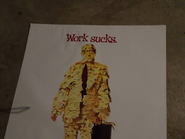 Original Movie Theater Poster Office Space Work sucks. Poster has damage to the top edge Double Sided Advance Poster Version A Approx. 40 inches x 27 inches Released in Theaters 2/19/99 Condition is...
