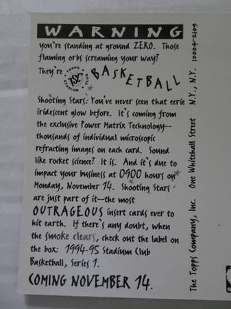 RISING STARS IMPACT: 11/14/94 TOPPS STADIUM CLUB BASKETBALL PROMO CARD Stadium Club Basketball Rising Stars - Space Promo Card Approx. 5 ½ x 6 Impact 11/14/94 This is an original promo card that...