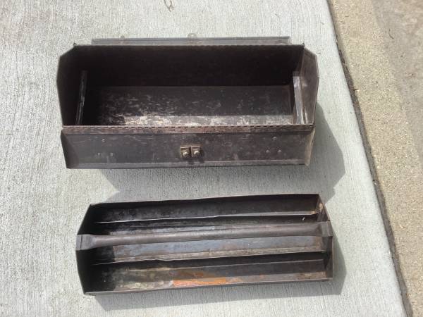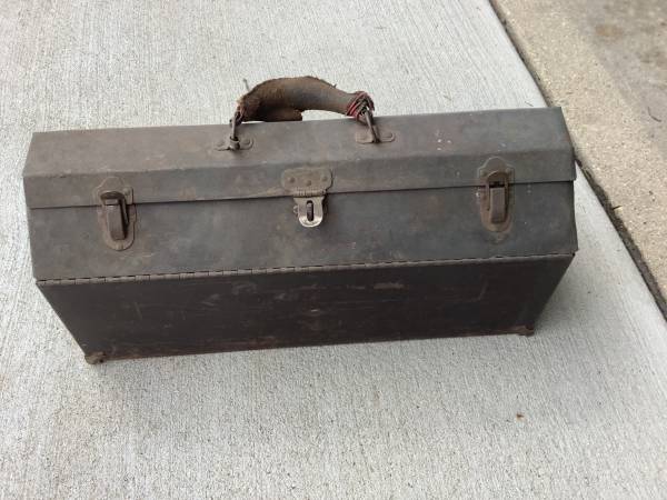 Vintage Tool Box , 19” long X 7” wide X 9” tall , perfect for rat rod etc ? Please call 9am - 8pm Sorry no Text ? Landline Thank you for looking