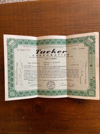 1947 Tucket Corporation green stock certificate. Great condition. 50 shares bought October 2, 1947.