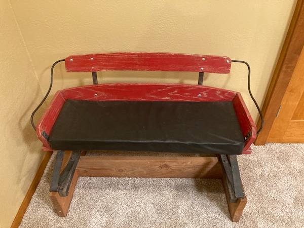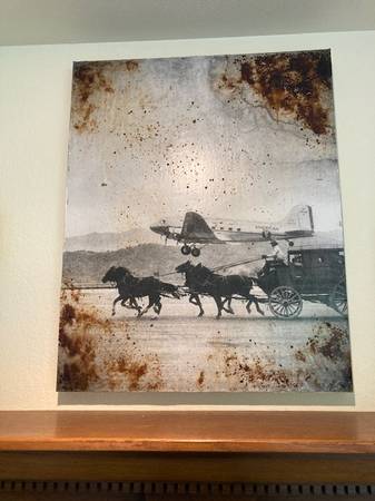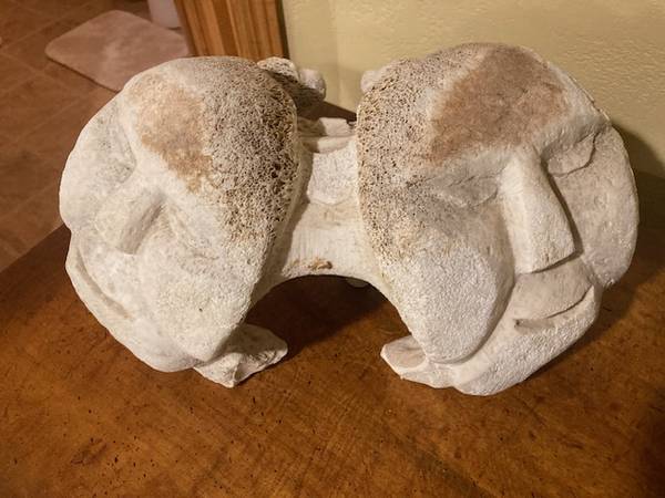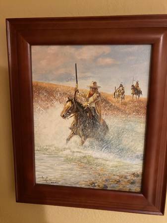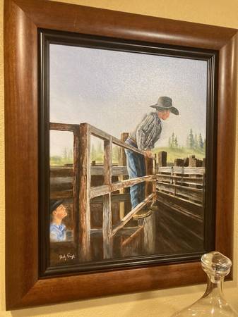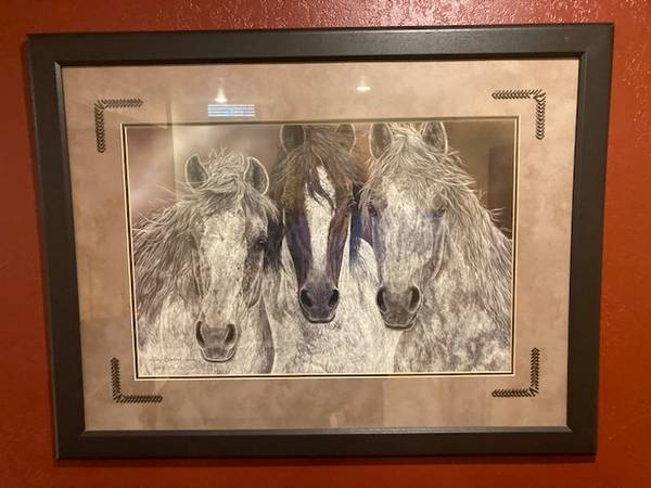 Whalebone carving (hunter dreaming of seal hunt) $1200, indigenous carved canoe paddle (spirit of the woodpecker) 1350, mountain man carving 400, Indian warrior bust, $550, pencil of 3 horses $300, who’s next (boys on corral rail) $75, two peas of a pod (2 angus calves)$250, Love Cattle (on hide) $100, being chased (rider and Indians) $100, Cow hide and 2 prints $300, buggy bench $150, others stuff $20-$100