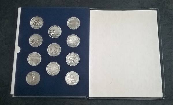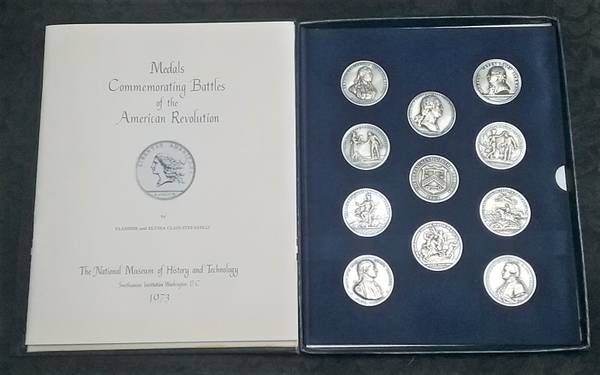 Complete set of 11 pewter medals commemorating battles of the American Revolution issued in 1973 by the United States Mint. Obtained from the estate of the only owner of this item. Medals are in their original album including a 43 page pamphlet describing the history of each medal and a protective slip case. All medals are in their original uncirculated/mint condition.