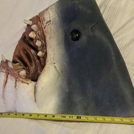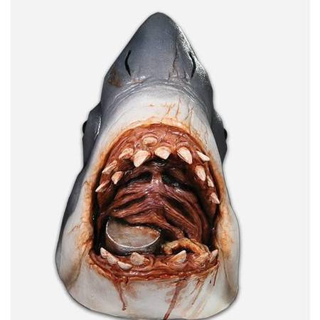 Officially licensed latex mask for the ocpnic Bruce the Shark from Jaws. Fits perfectly due to the foam filling on the inside which lines up your eyes perfectly with scuts in Bruce's mouth. Every detail is captured in the closing scenes including the tank that Brody shoots at the end of the film and the hand.