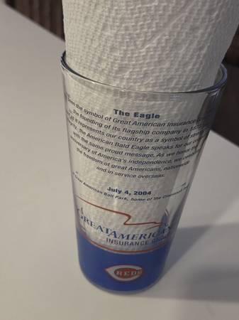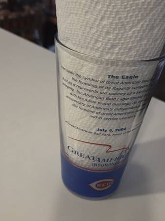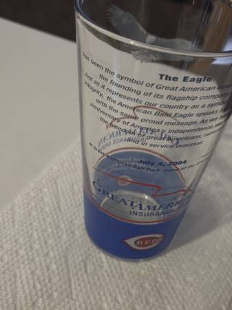 Commemorative Cincinnati Reds Baseball MLB Pint Glass Stadium Give Away from Great American Ballpark July 4, 2004. Eagle and sponsored by the Great American Insurance Group. Clean from a smoke free / pet free home!! Amazing piece of Reds and baseball history!!