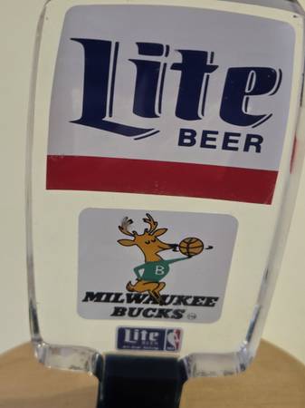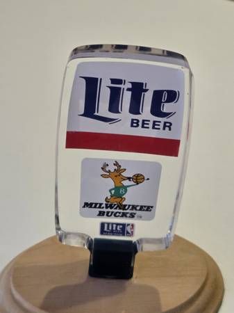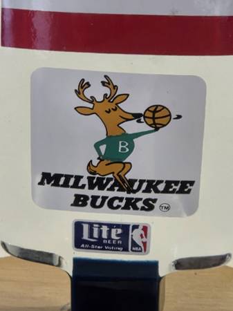 Vintage 1980's MILWAUKEE BUCKS MILLER LITE ACRYLIC BEER TAP HANDLE. Measures approx. 6 1/4” tall by 3" wide 9at widest part) by 7/8" thick. Very hard to find in amazing condition. Features BANGO and Milwaukee Bucks words and the Lite Beer words. Promo tap handle for NBA All Star Voting. Smoke free / Pet free home. Wooden tap handle stand not included.