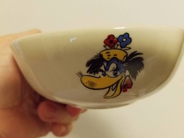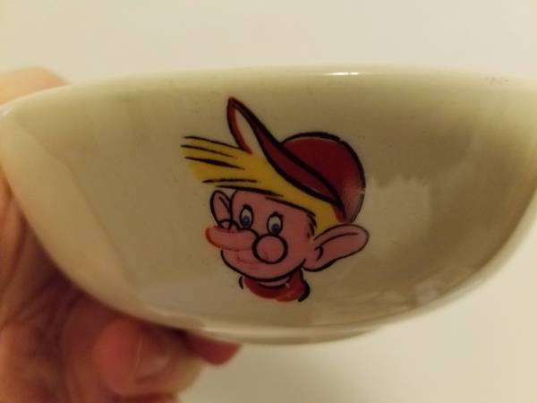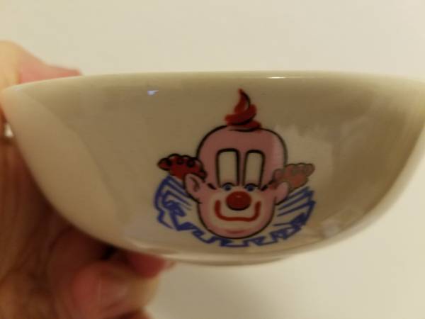 There is a cereal bowl that is five and one-half inches in diameter. Howdy Doody’s image is in the center of the bowl. There are four images on each side of the bowl (see pictures). They are Clarabell the Clown, Mayor Phineas T. Bluster, Flub-a-Dub and Dilly Dally. The bowl is in “very good” condition.