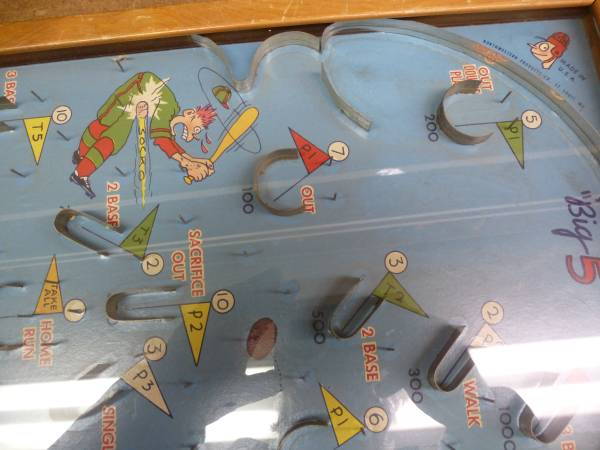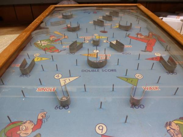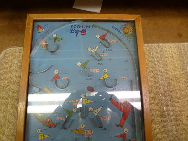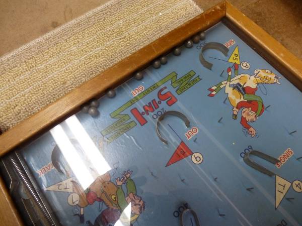 This vintage Northwestern Poosh-M-Up Big 5 Bagatelle Tabletop Pinball Game is a must-have for any collector or fan of classic board games. With a beautiful tan gold green color scheme and wooden, glass, and metal materials, this game is sure to impress. It includes five games: Baseball, Put-N-Take, Pennants, Colors, and Bagatelle, all of which are perfect for players of all ages and genders.This game is antique and was manufactured in the United States in 1930. It is a single player game and is suitable for ages 12 and up. The game is perfect for anyone who loves vintage manufacture and board & traditional games. Add this unique piece to your collection today! This is a very old wood/glass and metal pinball machine. It does work,but through all of 90 years it is difficult to play without some patience. The plunger which launches the balls is loose and you have to be careful to only allow one ball onto the launching pad and hold the plunger straight. It is more suitable as a display piece. It is colorful and a great conversation piece. Respond with any questions.