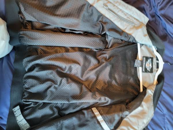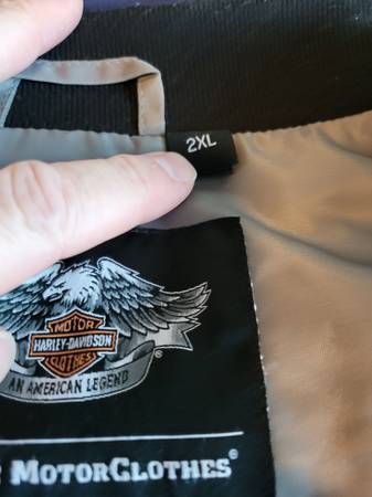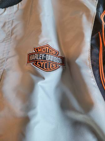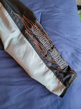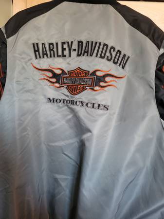 Harley Davidson 2XL men's jacket. The jacket is grey with flames on the sleeves. The jacket is in excellent condition with only a very small spot on the back (see in the photos).