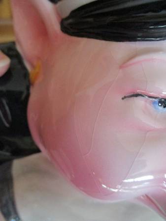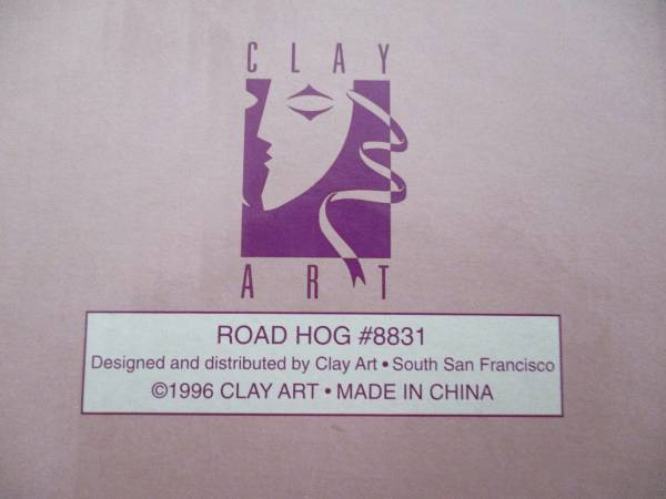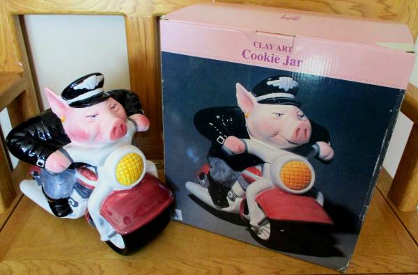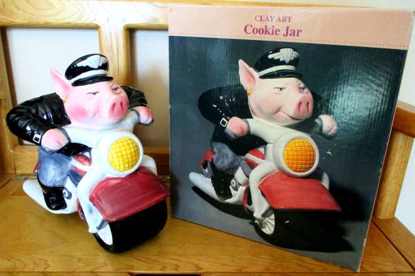 "ROAD HOG" PIG COOKIE JAR (Harley Davidson Style) with Beautiful Colors and Glaze Measures approximately 12" tall x 13" long x 9" wide By Clay Art #8831 dated 1996 in Original Box/Boxes Condition:...